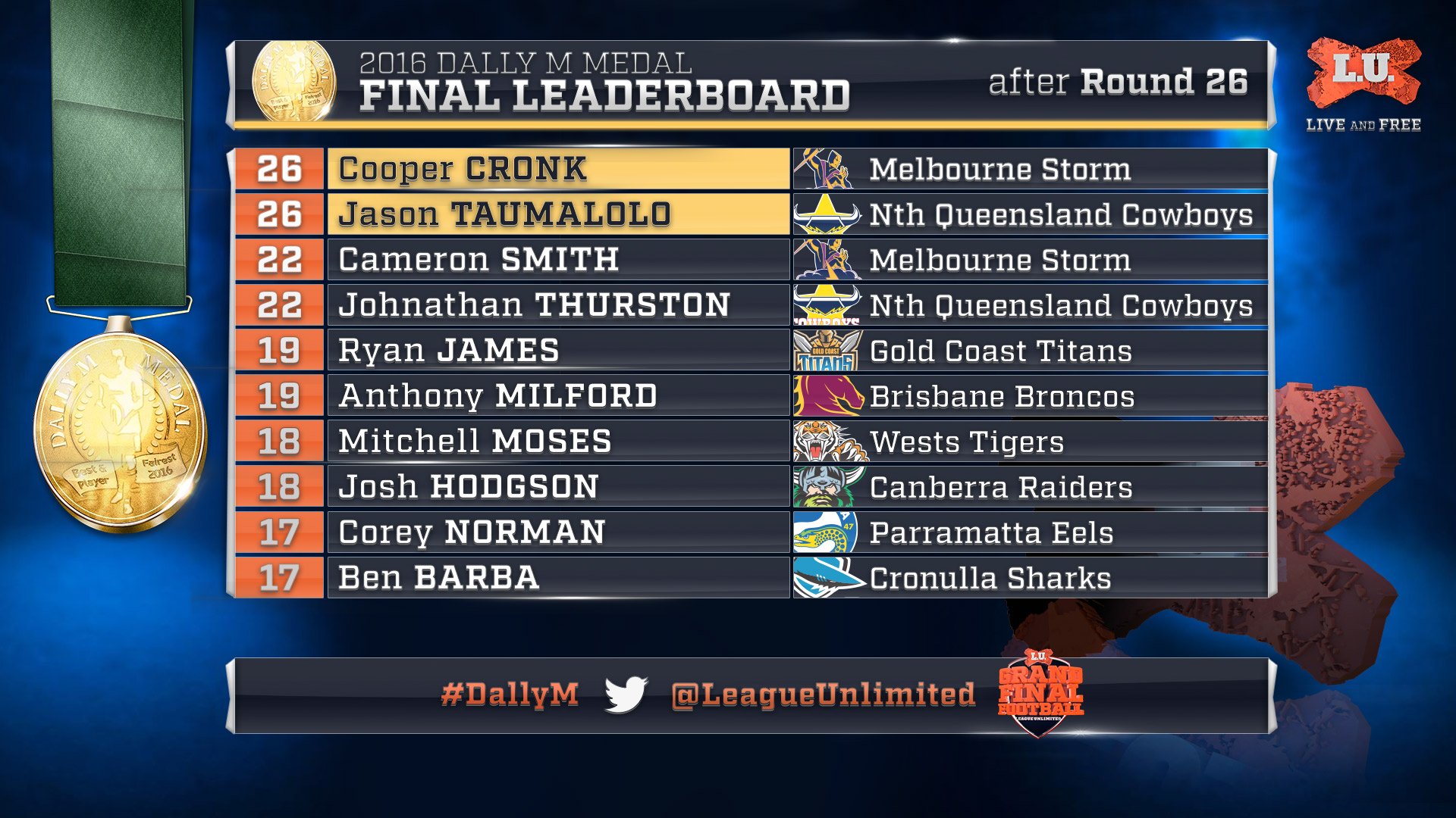 This is how the leaderboard is looking. Cowboys players Jason Taumalolo 3 Scott Drinkwater 2 and Kyle Feldt 1 scored all available points. Panthers star Nathan Cleary and Warriors captain Roger Tuivasa-Sheck are the new front-runners of the Dally M medal after climbing to the top of the rankings after round eight.
